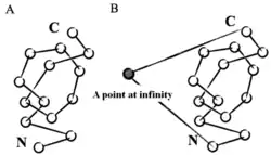 Mathematically, a knot is defined as a subset of three-dimensional space that is homeomorphic to a circle.[6] According to this definition, a knot must exist in a closed loop, while knotted proteins instead exist within open, unclosed chains. In order to apply mathematical knot theory to knotted proteins, various strategies can be used to create an artificial closed loop. One such strategy is to choose a point in space at infinite distance to be connected to the protein's N- and C-termini through a virtual bond, thus the protein can be treated as a closed loop. Another such strategy is to use stochastic methods that create random closures.