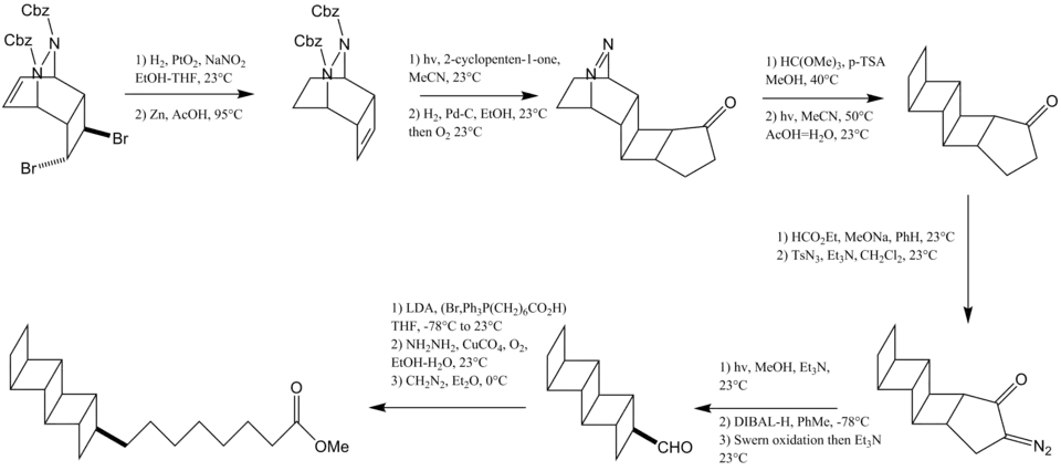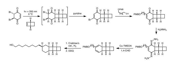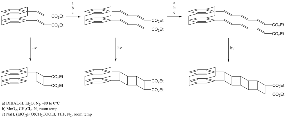 Various synthetic methods have been used for the laboratory synthesis of ladderane compounds. The three major approaches are (1) dimerization of polyene precursors, (2) the stepwise addition, one or two rings at a time, (3) and oligomerization.[3] Several examples of ladderane synthesis are outlined below.