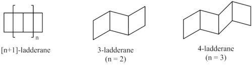 Synthetic approaches have yielded ladderanes of varying lengths. A classification system has been developed to describe ladderanes based on the number of consecutive rings.[3] The length of the ladderane is described by the number in brackets that precedes the word "ladderane". This is equal to the number of bonds shared by two cyclobutanes (n) plus 1.