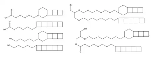 In chemistry, a ladderane is an organic molecule containing two or more fused cyclobutane rings. The name arises from the resemblance of a series of fused cyclobutane rings to a ladder. Numerous synthetic approaches have been developed for the synthesis of ladderane compounds of various lengths.[1] The mechanisms often involve [2 + 2] photocycloadditions, a useful reaction for creating strained 4-membered rings. Naturally occurring ladderanes have been identified as major components of the anammoxosome membrane of the anammox bacteria, phylum Planctomycetota.[2]