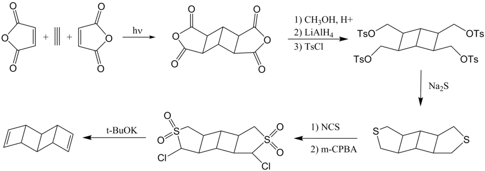 A different synthetic approach developed by Martin and coworkers has allowed for the synthesis of [4]-ladderanes.[4] The initial step involves the formation of a [2]-ladderane from the addition of two equivalents of maleic anhydride with acetylene. The remaining two rings are formed from the Ramberg–Bäcklund ring contraction.