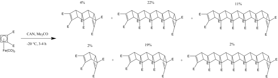 Ladderanes with lengths up to 13 cyclobutane rings have been synthesized by Mehta and coworkers.[6] This process involves the in situ generation of dicarbomethoxycyclobutadiene from its Fe(CO)3 complex at low temperatures with the addition of ceric(IV) ammonium nitrate (CAN). Generation of the butadiene rapidly forms a mixture of [n]-ladderanes of lengths up to n = 13 with an overall yield of 55%. All of the ladderanes synthesized through this method have one cis,syn,cis structure. This may be a result of the initial dimerization of two cyclobutadienes which preferably forms the syn product, shown below. The further dimerization only produces the anti product due to steric factors.