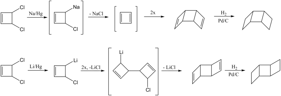 To generate the anti product, cis-3,4-dichlorocyclobutene is treated with lithium amalgam.[5] The lithium derivative undergoes a C-C coupling reaction to produce the open dimeric structure. This intermediate reacts to form the anti-diene, which can be hydrogenated to form the final anti-[3]-ladderane product.