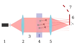 Laser diffraction analysis is typically accomplished via a red He-Ne laser or laser diode, a high-voltage power supply, and structural packaging.[8] Alternatively, blue laser diodes or LEDs of shorter wavelength may be used. The light source affects the detection limits, with lasers of shorter wavelengths better suited for the detection of submicron particles. Angling of the light energy produced by the laser is detected by having a beam of light go through a flow of dispersed particles and then onto a sensor. A lens is placed between the object being analyzed and the detector's focal point, causing only the surrounding laser diffraction to appear. The sizes the laser can analyze depend on the lens' focal length, the distance from the lens to its point of focus. As the focal length increases, the area the laser can detect increases as well, displaying a proportional relationship.