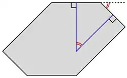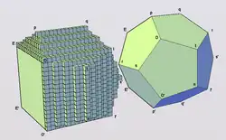 In the diagram, the green dodecahedron on the left is built from cubical units, with the faces having a Miller index of (210). Unlike the regular dodecahedron on the right, its faces are not regular pentagons, but they are close to regular in appearance. The piling of the cubical units forms the pentagonal dodecahedron of pyritohedral pyrite. The decrement of the layers is in the proportion of 2:1, which leads to a dihedral angle at the top edge pq of 126° 87′, closely corresponding to that of the empirical crystal, of 127° 56′. The diagram is based on an 1801 drawing by René Just Haüy.[17][18]