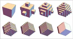 René Just Haüy showed in 1784[10] that the known interfacial angles could be accounted for if a crystal were made up of minute building blocks (molécules intégrantes), such as cubes, parallelepipeds, or rhombohedra. The 'rise-to-run' ratio of the stepped faces of the crystal was a simple rational number p/q, where p and q are small multiples of units of length (generally different and not more than 6).[6]: 46 [11] Haüy's method is named the law of decrements, law of simple rational truncations, or Haüy's law.[12]: 322 The law of rational indices was not stated in its modern form by Haüy, but it is directly implied by his law of decrements.[12]: 333