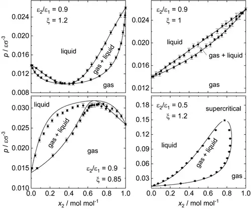 For Lennard-Jones mixtures, both fluid and solid phase equilibria can be studied, i.e. vapor–liquid, liquid–liquid, gas–gas, solid–vapor, solid–liquid, and solid–solid. Accordingly, different types of triple points (three-phase equilibria) and critical points can exist as well as different eutectic and azeotropic points.[74][71] Binary Lennard-Jones mixtures in the fluid region (various types of equilibria of liquid and gas phases)[31][75][76][77][78] have been studied more comprehensively then phase equilibria comprising solid phases.[79][80][81][82][83] A large number of different Lennard-Jones mixtures have been studied in the literature. To date, no standard for such has been established. Usually, the binary interaction parameters and the two component parameters are chosen such that a mixture with properties convenient for a given task are obtained. Yet, this often makes comparisons tricky.