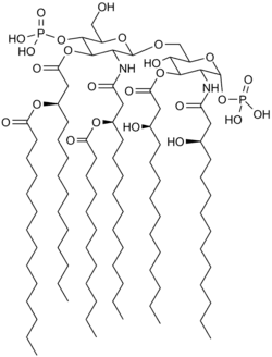 On the other hand, modified versions of lipid A can be used as components of vaccines (adjuvants) to improve their effect.[6] Monophosphorylated lipid A (MPL) is an FDA approved adjuvant that consists of a heterogeneous mixture of lipid A from Salmonella minnesota R595. The major lipid A species present in MPL lacks one of the two phosphate groups and five acyl chains. Other work has shown that the removal of one or two acyl chains from native lipid A can significantly reduce activation of inflammatory responses.[7]