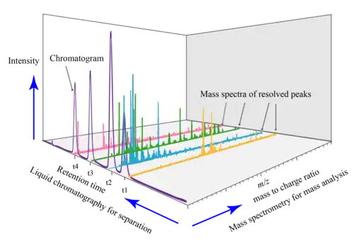 Liquid chromatography–mass spectrometry (LC–MS) is an analytical chemistry technique that combines the physical separation capabilities of liquid chromatography (or HPLC) with the mass analysis capabilities of mass spectrometry (MS). Coupled chromatography – MS systems are popular in chemical analysis because the individual capabilities of each technique are enhanced synergistically. While liquid chromatography separates mixtures with multiple components, mass spectrometry provides spectral information that may help to identify (or confirm the suspected identity of) each separated component.[1] MS is not only sensitive, but provides selective detection, relieving the need for complete chromatographic separation.[2] LC–MS is also appropriate for metabolomics because of its good coverage of a wide range of chemicals.[3] This tandem technique can be used to analyze biochemical, organic, and inorganic compounds commonly found in complex samples of environmental and biological origin. Therefore, LC–MS may be applied in a wide range of sectors including biotechnology, environment monitoring, food processing, and pharmaceutical, agrochemical, and cosmetic industries.[4][5] Since the early 2000s, LC–MS (or more specifically LC–MS/MS) has also begun to be used in clinical applications.[6]