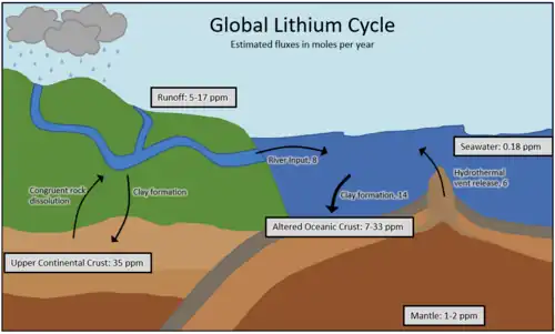 In the diagram above, lithium sinks are described in concentrations (ppm) and displayed as boxes.[1] Fluxes are shown as arrows and are in units of moles per year.[2] Continental rocks containing lithium are dissolved, transferring lithium to rivers or secondary minerals.[2] Dissolved lithium in run-off travels to the ocean.[2] Fluid release from hydrothermal vents contributes to oceanic lithium reserves while lithium is removed from the ocean by secondary mineral formation.[2]