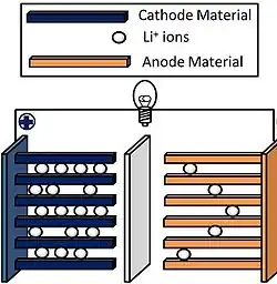 A general schematic of a lithium-ion battery. Lithium ions intercalate into the cathode or anode during charging and discharging.