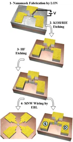 By using local oxidation nanolithography as tool for the fabrication of etch-resistant nanomasks, it is possible to fabricate nanoscale electronic devices, such as field-effect transistors, single-electron transistors, Josephson junctions, quantum rings or SQUIDs.[5] LON also allows to fabricate silicon nanowires (SiNWs) in a top-down fashion starting from silicon on insulator (SOI) wafers.[8] Local oxidation nanolithography contributes to the nanometric precision of the device fabrication. This top-down fabrication technique allows the fabrication of a large variety of SiNWs with different shapes, from angular to circular. It also allows the precise positioning of the silicon nanowires in any desired position, making easier its integration; indeed, this technique is compatible with the standard silicon CMOS processing technology. Single crystalline silicon nanowires have already shown a great potential as ultrasensitive sensors by detecting changes in the nanowire conductivity when a specific analyte is present.[9] Local oxidation nanolithography, therefore, is a promising technique to allow the realisation of array of biosensors.