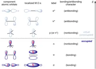 Organic chemistry is often discussed in terms of localized molecular orbitals in a qualitative and informal sense. Historically, much of classical organic chemistry was built on the older valence bond / orbital hybridization models of bonding. To account for phenomena like aromaticity, this simple model of bonding is supplemented by semi-quantitative results from Hückel molecular orbital theory. However, the understanding of stereoelectronic effects requires the analysis of interactions between donor and acceptor orbitals between two molecules or different regions within the same molecule, and molecular orbitals must be considered. Because proper (symmetry-adapted) molecular orbitals are fully delocalized and do not admit a ready correspondence with the "bonds" of the molecule, as visualized by the practicing chemist, the most common approach is to instead consider the interaction between filled and unfilled localized molecular orbitals that correspond to σ bonds, π bonds, lone pairs, and their unoccupied counterparts. These orbitals and typically given the notation σ (sigma bonding), π (pi bonding), n (occupied nonbonding orbital, "lone pair"), p (unoccupied nonbonding orbital, "empty p orbital"; the symbol n* for unoccupied nonbonding orbital is seldom used), π* (pi antibonding), and σ* (sigma antibonding). (Woodward and Hoffmann use ω for nonbonding orbitals in general, occupied or unoccupied.) When comparing localized molecular orbitals derived from the same atomic orbitals, these classes generally follow the order σ < π < n < p (n*) < π* < σ* when ranked by increasing energy. [20]