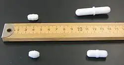 A magnetic stirrer consists of a magnetic bar placed within the liquid which provides the stirring action. The stir bar's motion is driven by another rotating magnet or assembly of electromagnets in the stirrer device, beneath the vessel containing the liquid.[4] Stir bars are typically coated in PTFE, or, less often, in glass; the coatings are intended to be chemically inert, not contaminating or reacting with the reaction mixture they are in.[4] Glass may be viable as an alternative if PTFE is unsuitable due to high temperature or chemical attack. In dissolving metal reductions that use an alkali metal dissolved in a primary amine, PTFE may be attacked to some extent.[5][6] Birch reductions (a common dissolving metal reduction) are often conducted in a glass vessel, thus indicating that a glass stir bar would likewise be compatible. Glass can be attacked by strong alkali (such as lye) depending on heat, exposure time, and concentration.[7]