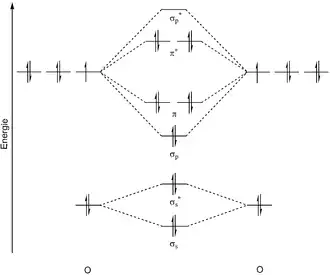 The peroxide ion is composed of two oxygen atoms that are linked by a single bond. The molecular orbital diagram of the peroxide dianion predicts a doubly occupied antibonding π* orbital and a bond order of 1. The bond length is 149 pm, which is larger than in the ground state (triplet oxygen) of the oxygen molecule (3O2, 121 pm). This translates into the smaller force constant of the bond (2.8 N/cm vs. 11.4 N/cm for 3O2) and the lower frequency of the molecular vibration (770 cm−1 vs. 1555 cm−1 for 3O2).[3]