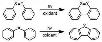 Under UV irradiation, stilbene and its derivatives undergo intramolecular cyclization to form dihydrophenanthrenes. In the presence of an oxidant, the dihydrophenanthrenes aromatize to give polycyclic aromatics. Typically, the dihydrophenanthrenes themselves are relatively unstable, and revert to cis-stilbenes in the absence of a hydrogen-trapping agent. Suitably substituted stilbenes may undergo irreversible, rearomatizing elimination or [1,n]-shift processes in the absence of an oxidant. Aryl enynes,[4] heteroatomic stilbene derivatives (e.g. amides[5]), and substrates containing a single heteroatom in place of the stilbene double bond[6] also undergo the reaction.