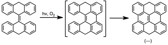 Photocyclization can be used as the final step of a sequence to generate a fused aromatic ring at a benzylic position. After benzylic bromization with N-bromosuccinimide, transformation to the phosphonium salt, and a Wittig reaction with anaromatic aldehyde, photocyclization fuses the aromatic rings. Iteration of this sequence results in helicenes.[18]