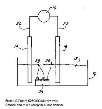 It was first observed by accident by Mike Marchywka[1] while trying to find a selective means to etch non-diamond carbon and fabricate simple astronomical UV detection devices.[4] These devices required a few specific features such as clean surfaces and patterned areas of non-diamond carbon but the approach has subsequently been explored as a more general means to terminate carbon surfaces and selectively clean and etch various other materials or structures. The term "Marchywka effect" is not used consistently and sometimes the term "bipolar surface treatment" is used[5] as the substrate is induced to become a bipolar electrode.[6] Various phrases such as "non-contacted electrochemical" process may also be used (see any references cited herein) or it may be mentioned as just an "electrochemical etch".[7][8]