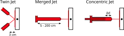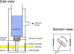 Using the matrix isolation technique, short-lived, highly-reactive species such as radical ions and reaction intermediates may be observed and identified by spectroscopic means. For example, the solid noble gas krypton can be used to form an inert matrix within which a reactive F3 ion can sit in chemical isolation.[1] The reactive species can either be generated outside (before deposition) the apparatus and then be condensed, inside the matrix (after deposition) by irradiating or heating a precursor, or by bringing together two reactants on the growing matrix surface. For the deposition of two species it can be crucial to control the contact time and temperature. In twin jet deposition the two species have a much shorter contact time (and lower temperature) than in merged jet. With concentric jet the contact time is adjustable.[2]