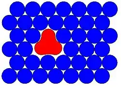 Diagram representing a triangular, guest species (in red) isolated in solid host matrix (in blue).
