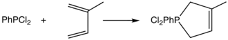 An illustrative reaction involves phenyldichlorophosphine and isoprene:[1]