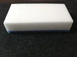 In the early 21st century, it was discovered that melamine foam is an effective abrasive cleaner.[2] Rubbing with a slightly moistened foam may remove otherwise "uncleanable" external markings from surfaces. For example, melamine foam can remove crayon, marker pen, and grease from painted walls and wood finishings, plastic-adhering paints from treated wooden tables, and adhesive residue and grime from hubcaps.[3] If the surface being cleaned is not sufficiently hard, it may be finely scratched by the melamine material. Similarly to a pencil eraser, the foam wears away during use, leaving behind a slight residue which can be rinsed off.