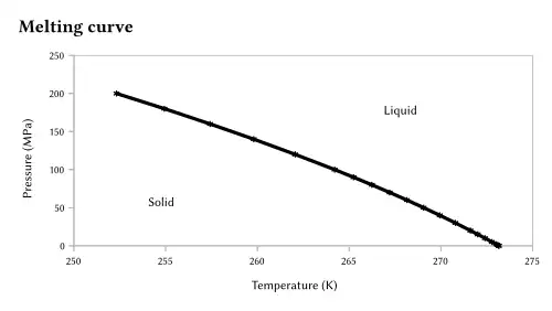 The melting point is sensitive to extremely large changes in pressure, but generally this sensitivity is orders of magnitude less than that for the boiling point, because the solid-liquid transition represents only a small change in volume.[11][12] If, as observed in most cases, a substance is more dense in the solid than in the liquid state, the melting point will increase with increases in pressure. Otherwise the reverse behavior occurs. Notably, this is the case of water, as illustrated graphically to the right, but also of Si, Ge, Ga, Bi. With extremely large changes in pressure, substantial changes to the melting point are observed. For example, the melting point of silicon at ambient pressure (0.1 MPa) is 1415 °C, but at pressures in excess of 10 GPa it decreases to 1000 °C.[13]