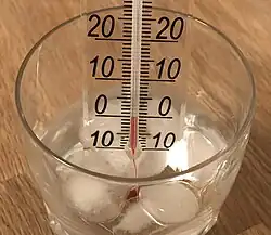 - ↑ The melting point of purified water has been measured as 0.002519 ± 0.000002 °C, see Feistel, R. & Wagner, W. (2006). "A New Equation of State for H2O Ice Ih". Journal of Physical and Chemical Reference Data. 35 (2): 1021–1047. Bibcode:2006JPCRD..35.1021F. doi:10.1063/1.2183324.