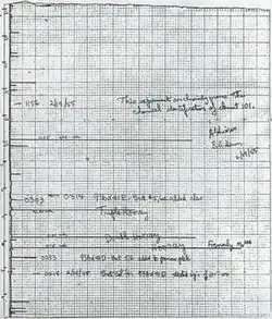 On the day of discovery, 19 February, alpha irradiation of the einsteinium target occurred in three three-hour sessions. The cyclotron was in the University of California campus, while the Radiation Laboratory was on the next hill. To deal with this situation, a complex procedure was used: Ghiorso took the catcher foils (there were three targets and three foils) from the cyclotron to Harvey, who would use aqua regia to dissolve it and pass it through an anion-exchange resin column to separate out the transuranium elements from the gold and other products.[6][8] The resultant drops entered a test tube, which Choppin and Ghiorso took in a car to get to the Radiation Laboratory as soon as possible. There Thompson and Choppin used a cation-exchange resin column and the α-hydroxyisobutyric acid. The solution drops were collected on platinum disks and dried under heat lamps. The three disks were expected to contain respectively the fermium, no new elements, and the mendelevium. Finally, they were placed in their own counters, which were connected to recorders such that spontaneous fission events would be recorded as huge deflections in a graph showing the number and time of the decays. There thus was no direct detection, but by observation of spontaneous fission events arising from its electron-capture daughter 256Fm. The first one was identified with a "hooray" followed by a "double hooray" and a "triple hooray". The fourth one eventually officially proved the chemical identification of the 101st element, mendelevium. In total, five decays were reported up until 4 a.m. Seaborg was notified and the team left to sleep.[6] Additional analysis and further experimentation showed the produced mendelevium isotope to have mass 256 and to decay by electron capture to fermium-256 with a half-life of 157.6 minutes.[4]