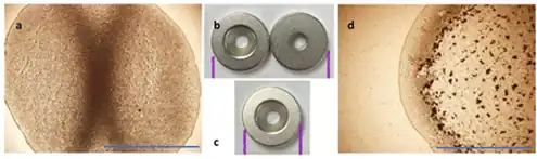 CuHARS have been shown to completely degrade under physiological conditions (cell culture media at 37 °C), even in the absence of cells; this is possibly due to the metal chelating properties of typical cell culture medias.[6] These may include the copper-binding properties of cerulosplasmin [7] and of albumin.[8] Additionally, CuHARS have been shown to polarize light using inverted microscopy.[3] Cobalt-containing MOBs (CoMOBs) have been shown to be susceptible to an externally applied magnetic field as shown in Figure 2. [9]