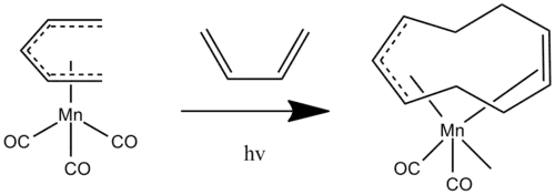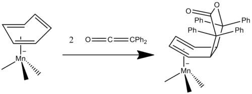 As an example, free Benzene is extremely unreactive in cycloadditions due to its aromaticity. Coordination of Benzene to a highly reduced Tricarbonylmanganese centre allows the Benzene to undergo cycloaddition with Diphenylketene.[10]