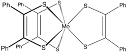 Dithiolene metal complexes can be found in coordination compounds where the metal centre is coordinated by one, two, or three dithiolene ligands. The tris(dithiolene) complexes were the first examples of trigonal prismatic geometry in coordination chemistry. One example is Mo(S2C2Ph2)3. Similar structures have been observed for several other metals.[6]