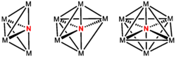 Owing to the ability of nitrido ligands to serve as a bridging ligand, several metal clusters are known to contain nitride ligands at their center. Such nitrido ligands are termed interstitial. In some cases, the nitride is completely encased in the center of six or more metals and cannot undergo reactions, although it contributes to the intermetallic bonding.[10]