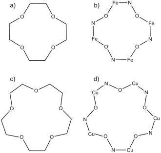 - ↑ Dendrinou-Samara, C.; Papadopoulos, A. N.; Malamatari, D. A.; Tarushi, A.; Raptopoulou, C. P.; Terzis, A.; Samaras, E.; Kessissoglou, D. P. (2005). "Inter-conversion of 15-MC-5 to 12-MC-4 manganese metallacrowns: structure and bioactivity of metallacrowns hosting carboxylato complexes". J. Inorg. Biochem. 99 (3): 864–75. doi:10.1016/j.jinorgbio.2004.12.021. PMID 15708808.