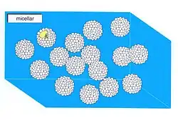 In colloid science, a micellar solution consists of a dispersion of micelles (small particles) in a solvent (most usually water). Micelles are made of chemicals that are attracted to both water and oily solvents, known as amphiphiles. In a micellar solution, some amphiphiles are clumped together and some are dispersed. Micellar solutions form when the concentration of amphiphile exceeds the critical micelle concentration (CMC) or critical aggregation concentration (CAC), which is when there are enough amphiphiles in the solution to clump together to form micells. Micellar solutions persist until the amphiphile concentration becomes sufficiently high to form a lyotropic liquid crystal phase.[1][2][3][4]
