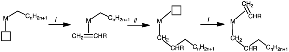 Steps in alkene polymerization. Step i involves binding of the monomer to the metal and step ii involves the migratory insertion step. These steps, which alternate from one side of the metal center to the other, are repeated many times for each polymer chain. The box represents a vacant (or extremely labile) coordination site.