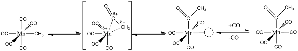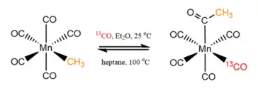Early studies were conducted on the conversion of CH3Mn(CO)5 to give the acetyl derivative.[4] Using 13CO, the products is cis [Mn(COCH3)(13CO)(CO)4] (scheme 1).