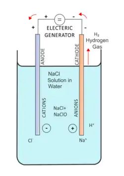 | Cl− + 2OH− ⇌ ClO− + H2O + 2e− |