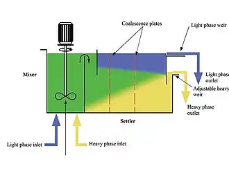 Mixer settlers are a class of mineral process equipment used in the solvent extraction process. A mixer settler consists of a first stage that mixes the phases together followed by a quiescent settling stage that allows the phases to separate by gravity.