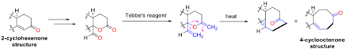- ↑ Philippo, Christophe M. G.; Vo, Nha Huu; Paquette, Leo A. (1991). "Two-carbon intercalation. 4-Cyclooctenones by tandem application of double-Tebbe and Claisen reactions". Journal of the American Chemical Society. 113 (7): 2762–2764. doi:10.1021/ja00007a066.