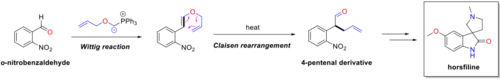 Tandem Wittig–Claisen reaction has also been applied to the construction of the spiro[pyrrolidin-3,3’-oxindole] ring system in natural products such as horsfiline.[2] The synthesis started with a simple o-nitrobenzaldehyde. A Wittig–Claisen reaction sequence converted the starting material to a 4-pentenal derivative that could serve as a versatile intermediate for the synthesis of various natural products. In this case, the 4-pentenal derivative was further converted to the natural product horsfiline, the active ingredient of a traditional herbal medicine with analgesic effects.