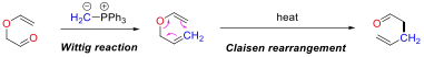 Modified Wittig–Claisen tandem reaction is a cascade reaction that combines the Wittig reaction and Claisen rearrangement together. The Wittig reaction generates the allyl vinyl ether intermediate that further participates in a Claisen rearrangement to generate the final γ,δ-unsaturated ketone or aldehyde product (Figure "Modified Wittig–Claisen tandem reactions").