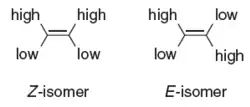 Diastereomers are distinct molecular configurations that are a broader category.[3] They usually differ in physical characteristics as well as chemical properties. If two molecules with more than one chiral centre differ in one or more (but not all) centres, they are diastereomers. All stereoisomers that are not enantiomers are diastereomers. Diastereomerism also exists in alkenes. Alkenes are designated Z or E depending on group priority on adjacent carbon atoms. E/Z notation describes the absolute stereochemistry of the double bond. Cis/trans notation is also used to describe the relative orientations of groups.
