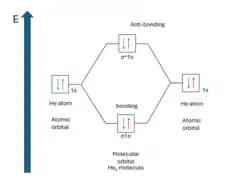 From bond order, one can predict whether a bond between two atoms will form or not. For example, the existence of He2 molecule. From the molecular orbital diagram, the bond order is . That means, no bond formation will occur between two He atoms which is seen experimentally. It can be detected under very low temperature and pressure molecular beam and has binding energy of approximately 0.001 J/mol.[17] (The helium dimer is a van der Waals molecule.)