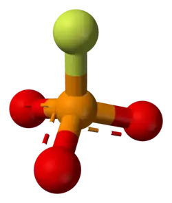 Organic derivatives can be highly toxic and include diisopropyl fluorophosphate. Some of the Novichok agents are monofluorophosphate esters. Names are given to these by naming the groups attached as esters and then adding "fluorophosphonate" to the end of the name. Two organic groups can be attached. Other related nerve gas substances may not be esters, and instead have carbon-phosphorus or nitrogen-phosphorus bonds. The organic fluorophosphonates react with serine esterases and serine proteases irreversibly. This prevents these enzymes from functioning. Such an important enzyme is acetylcholinesterase as found in most animals.[2] Some of the organic esters are detoxified in mammals by an enzyme in the blood and liver called paraoxonase PON1.[3]