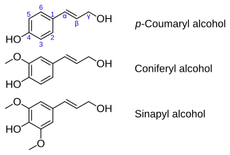 Monolignols, also called lignols, are the source materials for biosynthesis of both lignans and lignin and consist mainly of paracoumaryl alcohol (H), coniferyl alcohol (G) and sinapyl alcohol (S). These monolignols differ in their degree of methoxylation of the aromatic ring.[1]