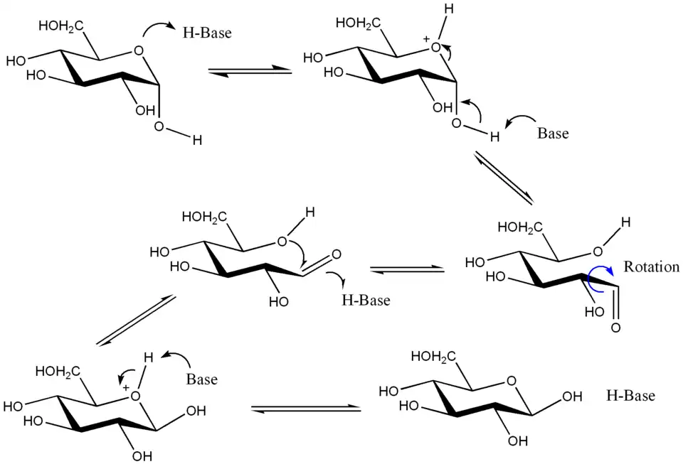 In stereochemistry, mutarotation is the change in optical rotation of a chiral material in a solution due to a change in proportion of the two constituent anomers (i.e. the interconversion of their respective stereocenters) until equilibrium is reached. Cyclic sugars show mutarotation as α and β anomeric forms interconvert.[1] The optical rotation of the solution depends on the optical rotation of each anomer and their ratio in the solution.