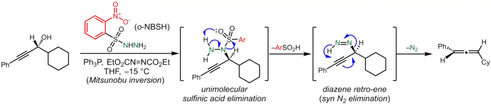 The reaction is a three-step process in which the alcohol first undergoes a Mitsunobu reaction with an arenesulfonylhydrazine in the presence of triphenylphosphine and diethyl azodicarboxylate. Unlike hydrazone-synthesis reactions, this reaction occurs on the same nitrogen of the hydrazine that has the arenesulfonyl substituent. Upon warming, this product undergoes an elimination of arylsulfinic acid to give an unstable diazene as a reactive intermediate. The diazene extrudes N2 to give isolated allene product. The authors describe this last step as a [3,3]-sigmatropic reaction in the original report but call it a retro-ene reaction in another publication.[3][1] (Note: The IUPAC defines a sigmatropic rearrangement as a pericyclic reaction involving both breaking and formation of a new σ bond in which the total number of π and σ bonds do not change,[4] whereas a retro-ene reaction involves the fragmentation of a molecule to a fragment with a double bond with allylic hydrogen (the 'ene') and a multiple-bonded species (the 'enophile') via a cyclic transition state.[5] In this case, the reaction occurs with the net gain of a π bond and loss of a σ bond, so strictly speaking, only the description of the reaction as a retro-ene reaction is apt.)