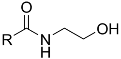 These amides conceptually can be formed from a fatty acid and ethanolamine with the release of a molecule of water, but the known biological synthesis uses a specific phospholipase D to cleave the phospholipid unit from N-acylphosphatidylethanolamines.[9] Another route relies on the transesterification of acyl groups from phosphatidylcholine by an N-acyltransferase (NAT) activity. The suffixes -amine and -amide in these names each refer to the single nitrogen atom of ethanolamine that links the compound together: it is termed "amine" in ethanolamine because it is considered as a free terminal nitrogen in that subunit, while it is termed "amide" when it is considered in association with the adjacent carbonyl group of the acyl subunit. Names for these compounds may be encountered with either "amide" or "amine" varying by author.[10]