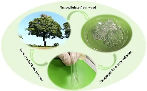 Nanocellulose can be used to prepare flexible and optically transparent paper. Such paper is an attractive substrate for electronic devices because it is recyclable, compatible with biological objects, and easily biodegrades.[93]